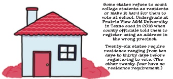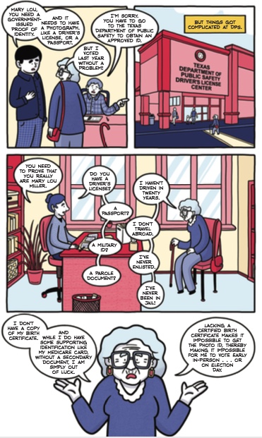 Except for the common date by which voters must submit their choices for president and members of Congress—this year, that date is November 3—there is no national system for elections. Every state makes its own rules on who can vote, how, when, and where. And some states make voting harder than others. In both the text and graphic versions of Fault Lines in the Constitution, we discuss some of these issues, including